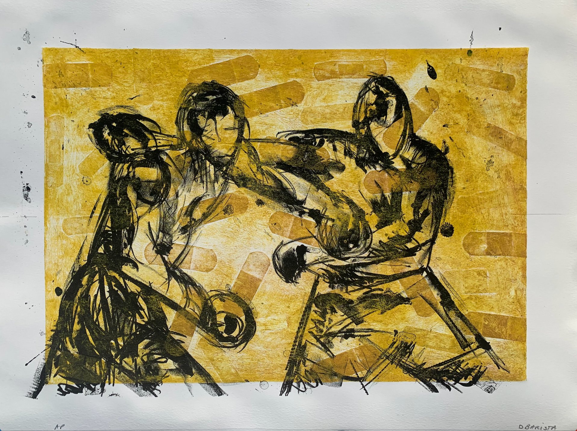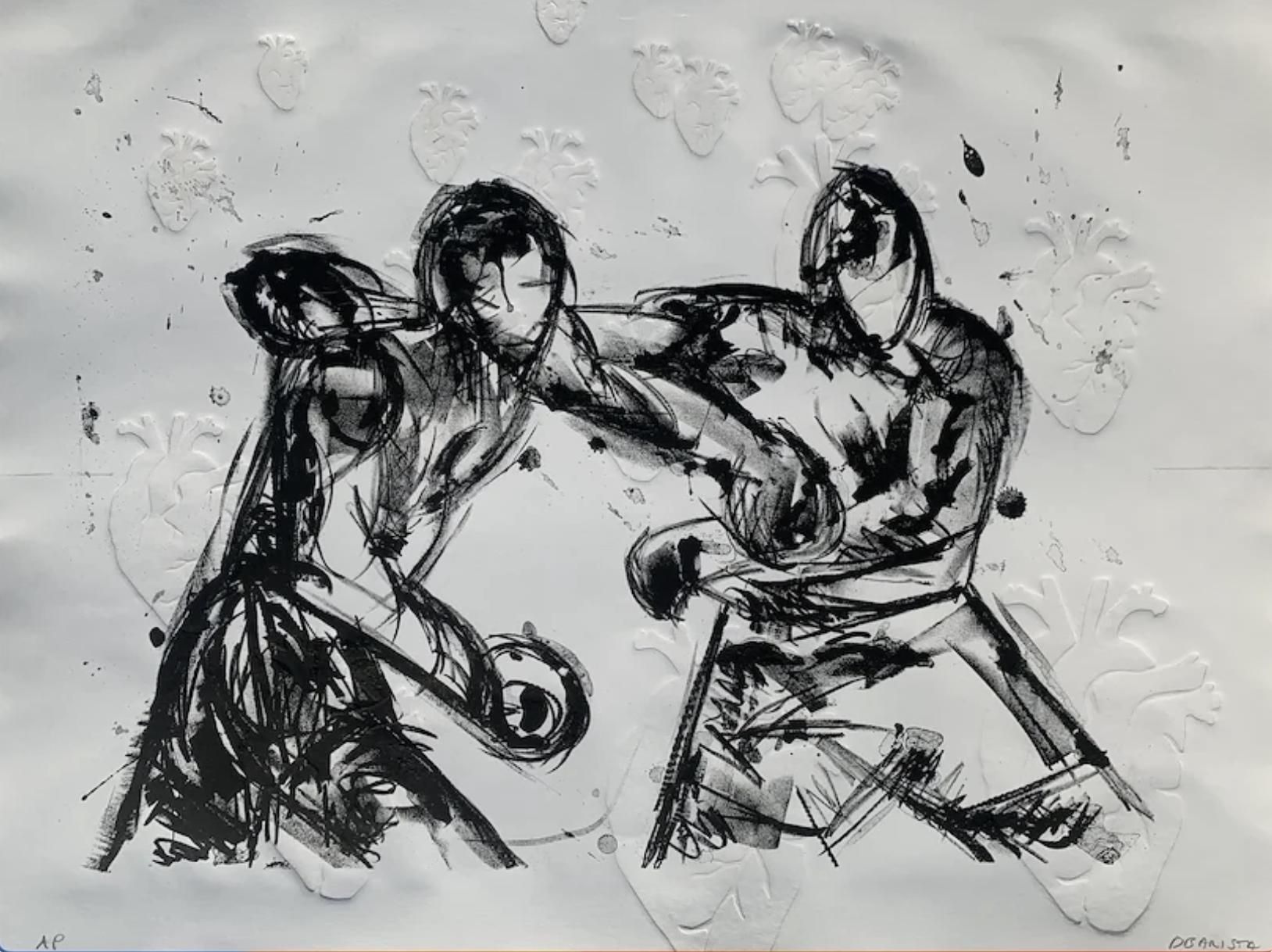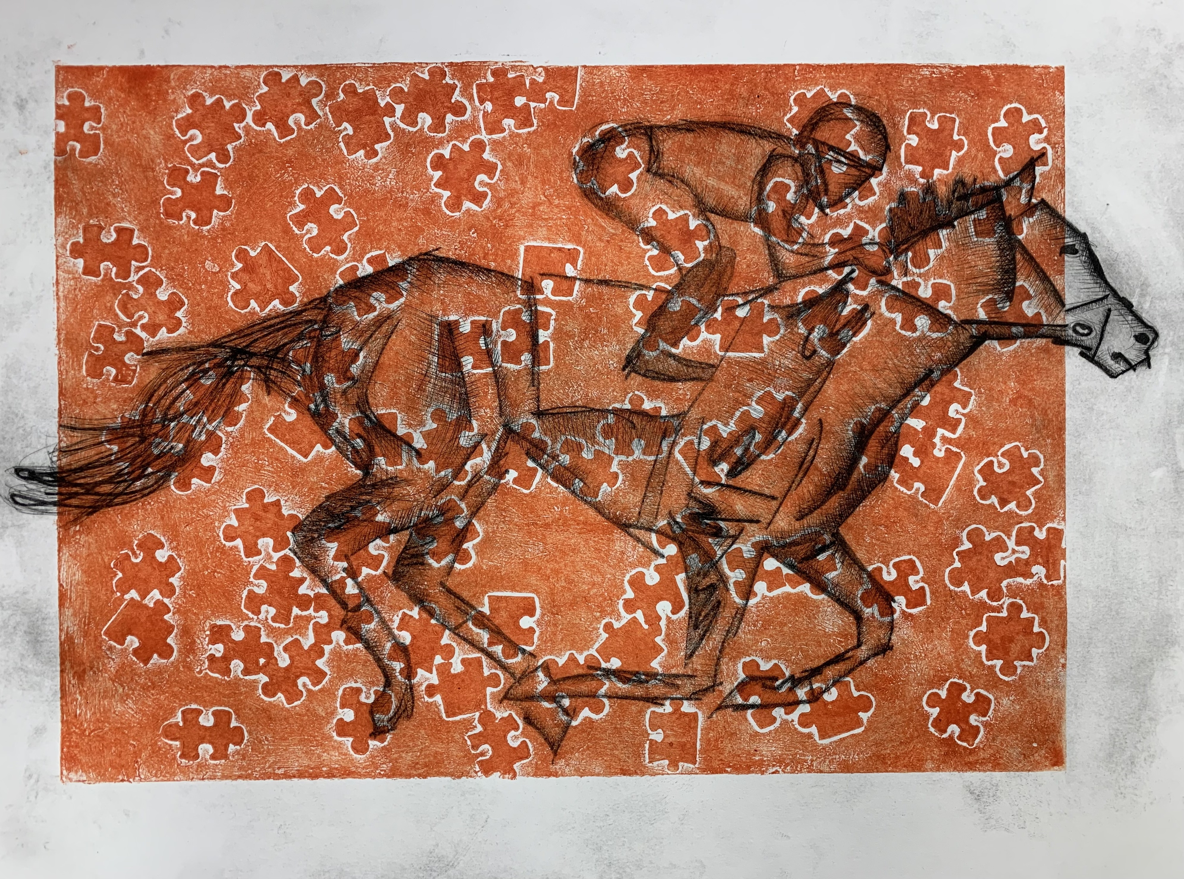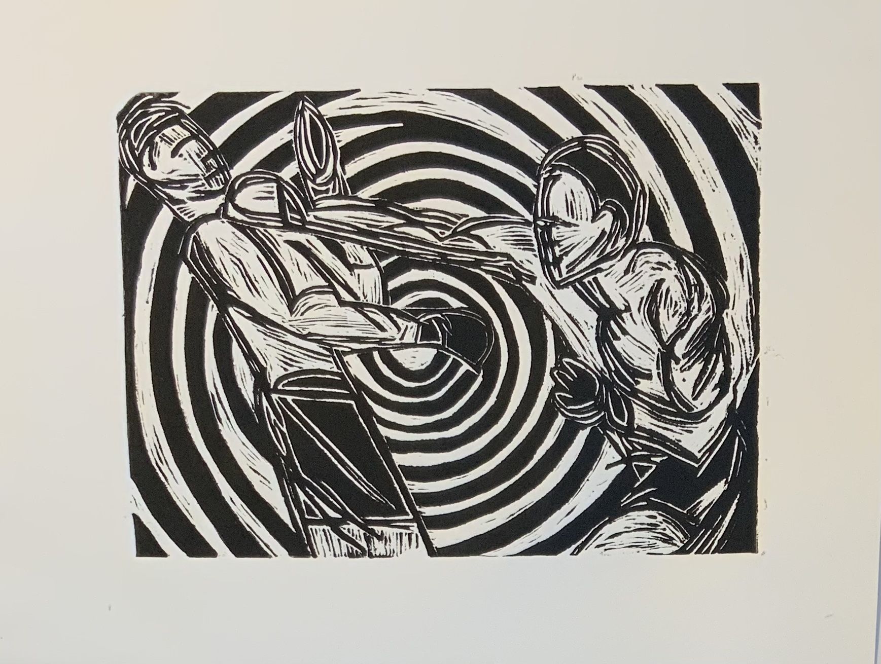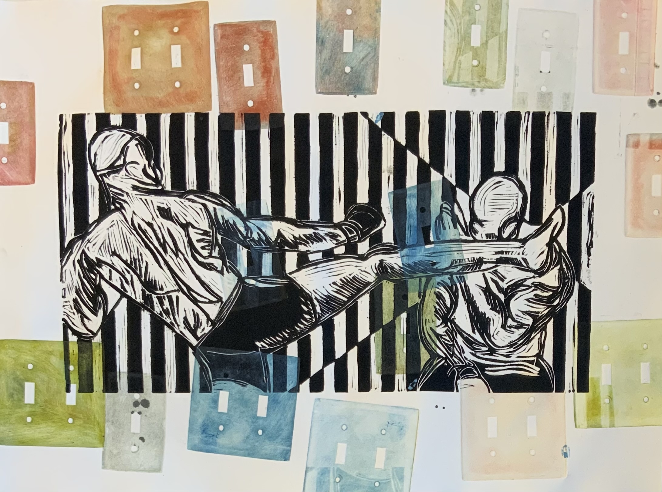 Dry Point Etching and Charcoal on Scorched Paper Mounted to Wood