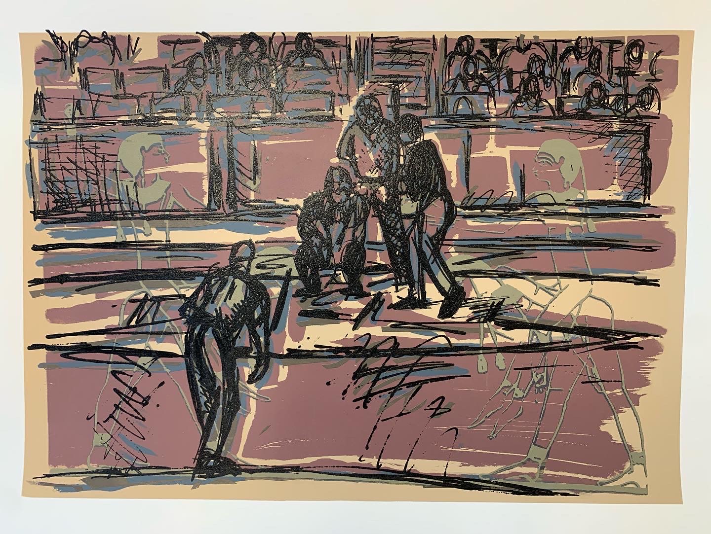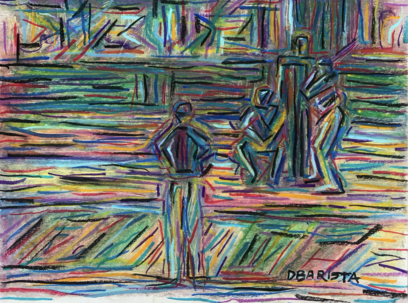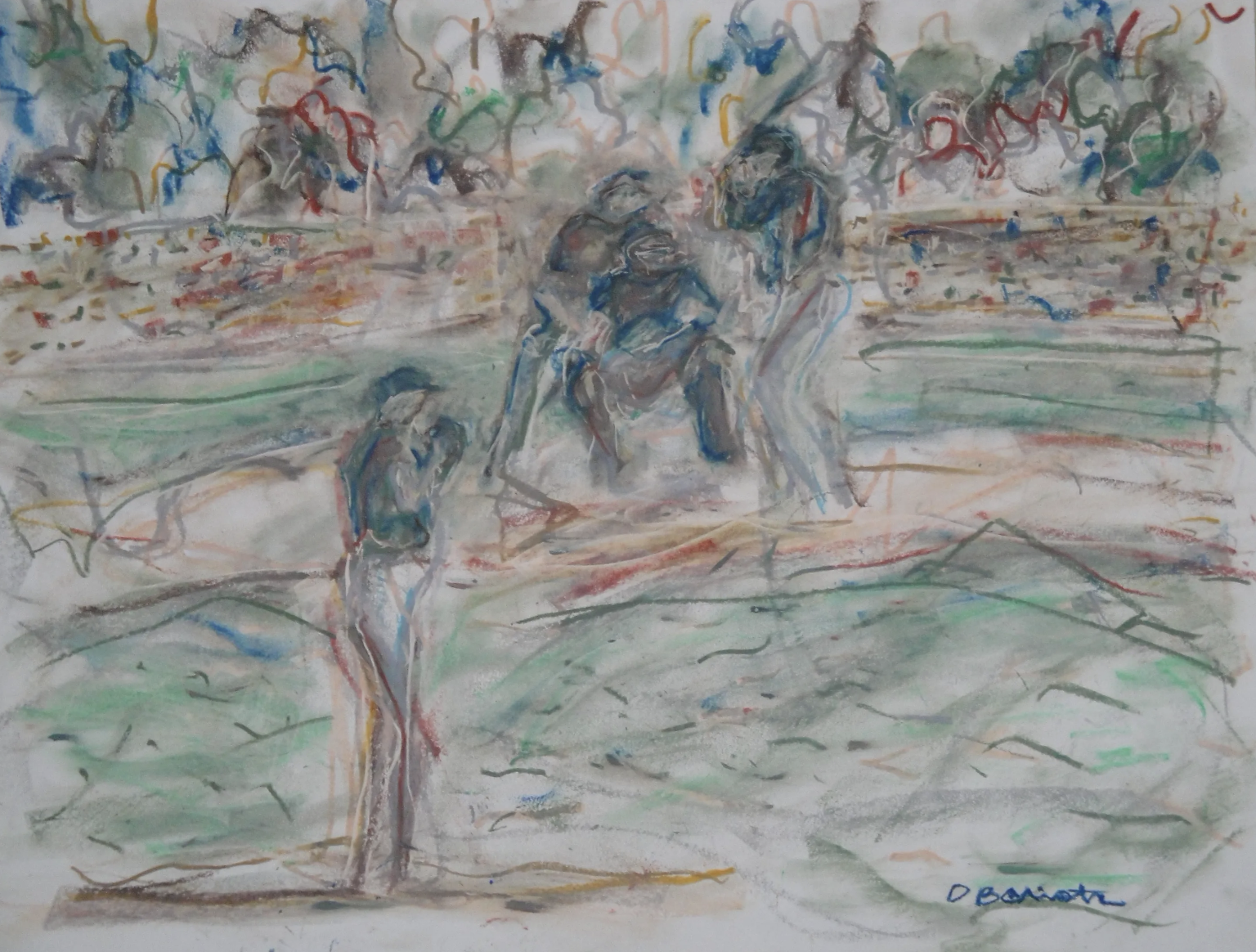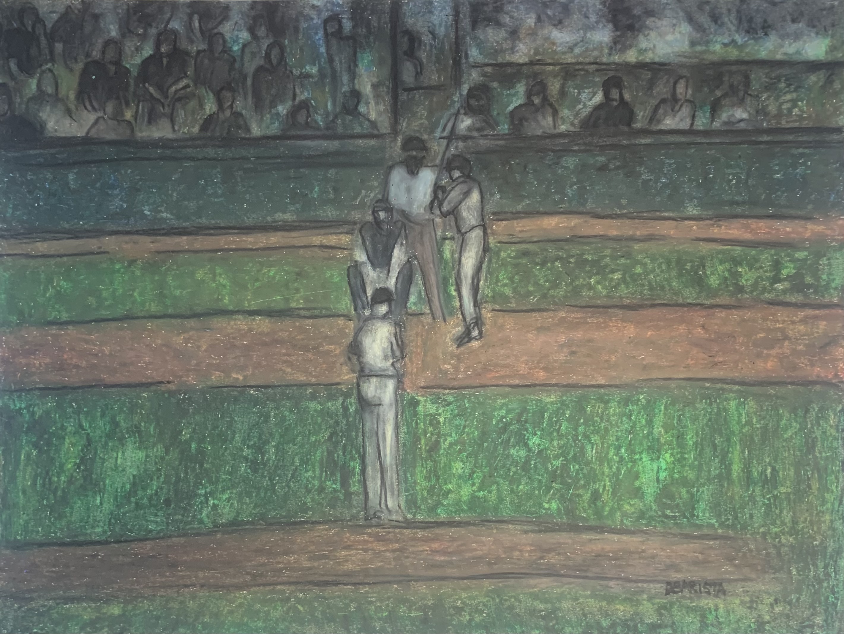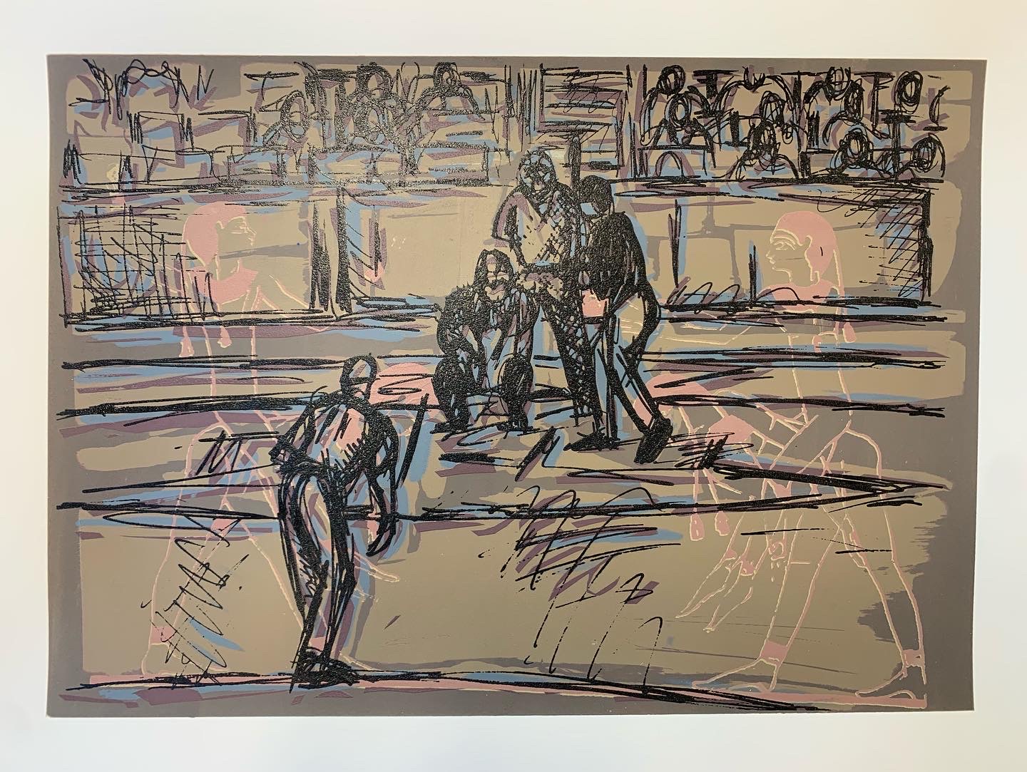 Dry Point Etching and Charcoal on Scorched Paper Mounted to Wood
